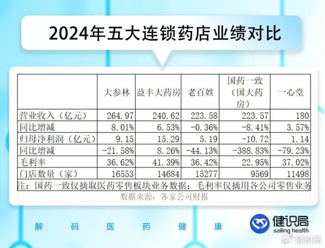 2024年,大参林依旧稳坐国内连锁零售药店头把交椅,拿下最高营收264.97亿元;益丰大药房营收屈居第二,净利润却是最高的,达到14.97亿元。老百姓、国药一致营收分别位居第三、第四,一心堂排在最末,刚刚抵达180亿元。