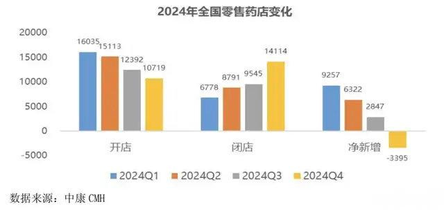 2024年,全国实体药店零售市场规模为6119亿元,同比下降了1.8%;全国零售药店闭店率达到5.7%,每个季度平均有9807家零售药店关门,尤其在第四季度,零售药店数量出现了负增长,关店数量达到季度最高,为14114家。